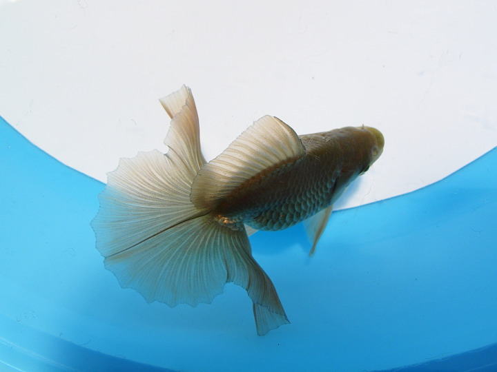 右の写真は、先日の品評会へ出品した魚を入れているプラ舟の換水後の状態です。出品前から少しずつ青水を薄めて、当日はごく薄い青水で輸送していたこともあって、帰ってからも1つのプラ舟にまとめて管理しています。
