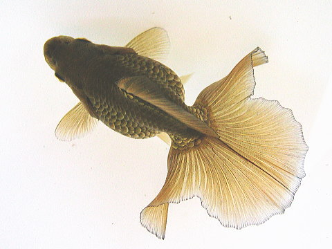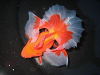 | 左端は雌、中と右の写真は同一魚で雄。どちらも私が初めて人工授精で採卵した中から育てた土佐錦魚です。親はO氏から分譲された稚魚から得たもの同士の交配です。メスは尾付けが完全な板前ですので、3歳以降の伸びに期待しています。 |