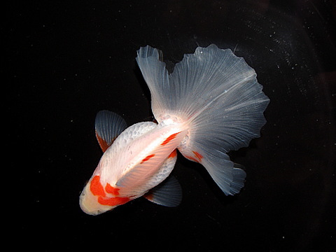 | 雄親(両親)はこの年(2011年)の全国大会の二歳の部の優勝魚と兄弟魚で、色目のはっきりした更紗。雌魚(両親)は胸鰭と尻鰭にわずかに赤を残すまでに色抜けした魚で、大きな尾と返しが魅力の魚。 | 雄魚(両親)は丸手で非常に太い体を持ち、褪色後は濃い色目の鹿の子更紗となった魚。雌魚(両親)は前年(2010年)の全国大会の二歳魚の部で優勝した三歳魚。セオリー通りの丸手と長手の組合せ。 | 雄親(両親)はこの年(2011年)の全国大会の二歳の部の優勝魚と兄弟魚で、色目のはっきりした更紗。雌魚(両親)も濃い赤の体色と、ともに当歳の早くから褪色した2歳魚同士で、色柄目当ての掛合せ。 | 雄は丸手で尾の後ろと返しの大きな3歳魚(両親)、雌は東京のT氏の系統で極めて太い体を持つ面被りの更紗で、こちらも早期褪色、色柄と太い体を狙っての掛け合わせ。 | 雄は親骨を後ろに流す更紗の魚(両親)、雌は親骨の張りが強い魚(両親)で、中間型を得ることを狙った交配。雄の親骨は二歳秋の姿でも流したままだが反転は大きい。 | |||||||||